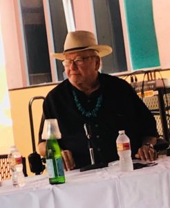 Momaday was recognized for his many achievements at the 2018 SWAIA Santa Fe Indian Market, the largest indigenous gathering for Native arts and culture in North America.  Sitting on a panel that included his daughter, Jill Momaday, French scholar, Dr. Joëlle Rostkowski, and Autry Museum of the American West director, Dr. W. Richard West, the impetus for the event was a recently published book by Joëlle Rostkowski entitled, N. Scott Momaday and the Sense of the Sacred:  A Native Poet and Artist, a Universal Voice.  After opening remarks from each participant, Momaday shared thoughts on his relationship with the panelist, talked about his world travels and teaching, and recited two poems.  Of particular interest was The Bear, a poem he delivered in his commanding voice.  While reciting the poem, thunder broke out overhead.  After the recitation Momaday joked, “I did that,” referencing a comment his daughter made about Momaday having a “voice like God.” The audience joined him in laughter.