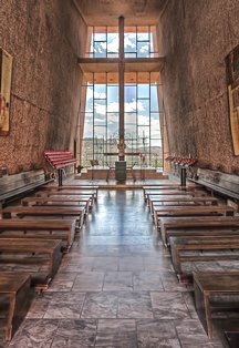 As we drove up to the church, the simple beauty of the building struck us: a large front edifice with a cross arose from the rocks, surrounded by red rock, mesas, and cliffs. It was stunning. Atop, a short walkway wound around to the beautiful chapel. And though the chapel was small, it had a meditative quality: candles, pews, and Gregorian chant invited prayer and thought. In short, it was a peaceful place, even with the mass of people coming in and out snapping photos.