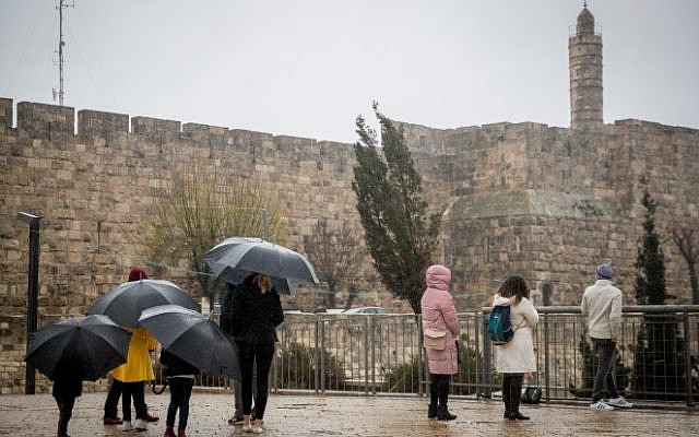 People walk in the rain next to Jaffa gate in Jerusalem’s Old City on January 9, 2019. (Yonatan Sindel/Flash90)