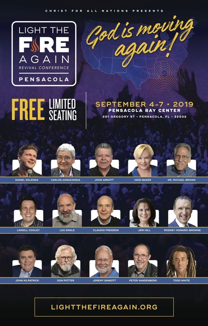 “Light the Fire Again Conference 2019 — Pensacola,” spearheaded by Christ for All Nations, will take place Sept. 4-7, 2019, in Pensacola, Florida – the location of the Brownsville Revival/Pensacola Outpouring in 1995. Registration for Light the Fire Again — Pensacola is free at the Christ for All Nations website at www.cfan.org.