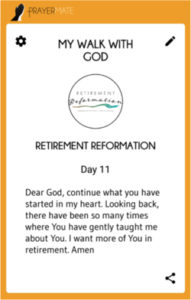 The Retirement Reformation’s free Prayer Walk Guide — and the PrayerMate phone app devotional connected with the movement — aims to mobilize an army of gray-haired go-getters. The prayer guide and phone app can be downloaded free from the Retirement Reformation website.