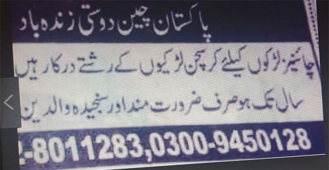 Saleem Iqbal, a Christian community activist in Lahore said, “The gang members normally tell Muslim families the Chinese suitor has recently converted to Islam, and to the Christians they say the Chinese men have converted to Christianity.”