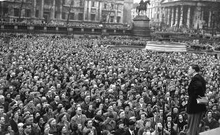 Photo captions: 1) Billy Graham speaking at one of his packed crusades around the world. (BGEA). 2) Billy Graham addressing large crowd in London’s Trafalgar Square. 3) Singer Sir Cliff Richard with Billy Graham at Villa Park, Birmingham, in 1984. (Daily Mirror). 4) Charles Gardner with his wife, Linda.