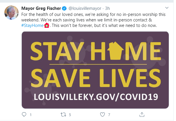 “Our job is to deny the virus,” the mayor told television station WDRB. “If we don’t do that, more lives will be lost. I know it’s tough…I just can’t allow (drive-thru church services) to happen.”