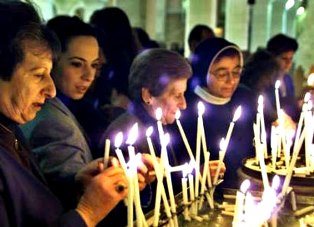 Photo captions: 1) Ultra-Orthodox Jews attacked a Messianic congregation. 2) Shofar (a ram’s horn trumpet used by ancient Jews in religious ceremonies and as a battle signal, now sounded at Rosh Hashanah and Yom Kippur), being blown at a Messianic service. 3) The Tel Aviv Bible Society bookstore. 4) Palestinian believers lighting candles in the Church of the Nativity in the biblical West Bank town of Bethlehem. 5) Dan Wooding outside the Church of the Nativity.