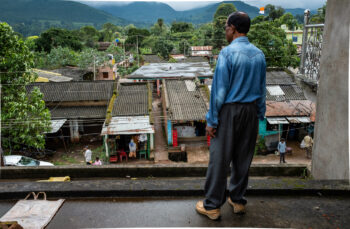 Deep in the jungles of the Indian state of Odisha, a man stands on his newly rebuilt concrete balcony overlooking his neighbors in the patioed market just in front of his home in Kandhamal.