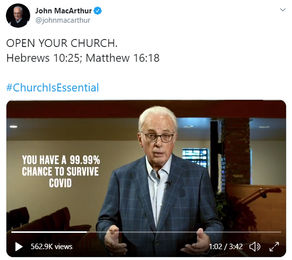 MacArthur, who is in the midst of an ongoing legal battle with California officials for holding church services amid coronavirus restrictions, claimed that people have a high rate of surviving the disease.
