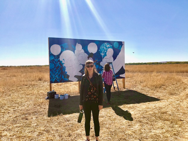 Five women—all muralists—decode the geography and paint portraits of the land and people, part of the reconstitution of Valle de Oro. We’re told it’s the first of its kind, conservation and construction holding hands in fellowship. One artist tells of the plan: particulars of how the land will move, the forest extended, and the soil will smile. Five Sandhill crane nibble the ground. One muralist, Jessica Chao, is giddy. Chao hosts round sunglasses on her face, and wears paint-splattered clothes. This is her first mural. She pulls up her Toyota to support her paints, a truck-easel. Chao renders trees on the wooden billboard, a pink and purple sky, offering a unique view of place. “What an honor! I’m so thankful to be a part of it,” she tells us, smiling beneath the sun.